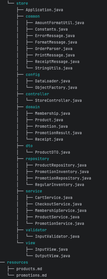리소스 파일에 있는 정보를 가져와 상품과 프로모션 레포지토리에 저장하려 했고 레포지토리는 CRUD에 집중하려고 했다. 상품 레포지토리에서 일반, 프로모션 각각을 나눠서 다루려고 했다.